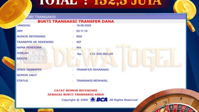 DEWATOGEL mengucapkan selamat kepada user id : FAS*** yang telah berhasil mendapatkan jackpot pada permainan LIVE CASINO DI BACCARAT. Kemenangan sebesar Rp 152.500.000,-. telah dibayarkan LUNAS oleh pihak dewatogel kepada pemilik user id setelah yang bersangkutan mengisi formulir withdraw. Proses pencairan dana berlangsung sangat cepat hanya dalam waktu 5-10 menit sudah berada dalam rekening pemilik user id. Bukti transfer yang dapat anda lihat adalah bukti SAH / VALID yang langsung di dapatkan melalui bukti transaksi dari Bank yang digunakan untuk pengiriman dana pada rekening pemilik user id. Terima kasih kami sampaikan kepada para pengguna setia DEWATOGEL yang telah menggunakan situs kami, sebagai Bandar Terpercaya yang pastinya membayar semua kemenangan member hingga lunas. Apakah DEWATOGEL PENIPU ? Reputasi “DEWATOGEL TERPERCAYA” sudah sangat melekat. puluhan hingga ratusan ribu pengguna setia DEWATOGEL tetap menggunakan situs terbesar dan terbaik di Indonesia ini. Hapus rasa was-was dan khawatir anda, kemenangan anda berapapun PASTI dibayarkan hingga lunas.