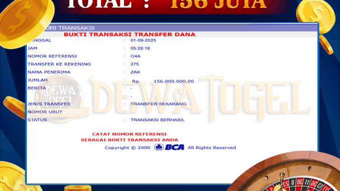 DEWATOGEL mengucapkan selamat kepada user id : UPA*** yang telah berhasil mendapatkan jackpot pada permainan LIVE CASINO DI ROULETTE 2 – FAST . Kemenangan sebesar Rp 156.000.000,-. telah dibayarkan LUNAS oleh pihak dewatogel kepada pemilik user id setelah yang bersangkutan mengisi formulir withdraw. Proses pencairan dana berlangsung sangat cepat hanya dalam waktu 5-10 menit sudah berada dalam rekening pemilik user id. Bukti transfer yang dapat anda lihat adalah bukti SAH / VALID yang langsung di dapatkan melalui bukti transaksi dari Bank yang digunakan untuk pengiriman dana pada rekening pemilik user id. Terima kasih kami sampaikan kepada para pengguna setia DEWATOGEL yang telah menggunakan situs kami, sebagai Bandar Terpercaya yang pastinya membayar semua kemenangan member hingga lunas. Apakah DEWATOGEL PENIPU ? Reputasi “DEWATOGEL TERPERCAYA” sudah sangat melekat. puluhan hingga ratusan ribu pengguna setia DEWATOGEL tetap menggunakan situs terbesar dan terbaik di Indonesia ini. Hapus rasa was-was dan khawatir anda, kemenangan anda berapapun PASTI dibayarkan hingga lunas.