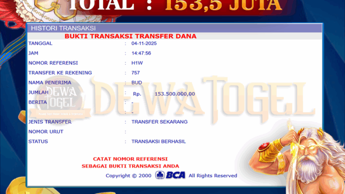 DEWATOGEL mengucapkan selamat kepada user id : ENI*** yang telah berhasil mendapatkan jackpot pada permainan SLOT DI SWEET BONANZA 1000. Kemenangan sebesar Rp 153.500.000,-. telah dibayarkan LUNAS oleh pihak dewatogel kepada pemilik user id setelah yang bersangkutan mengisi formulir withdraw. Proses pencairan dana berlangsung sangat cepat hanya dalam waktu 5-10 menit sudah berada dalam rekening pemilik user id. Bukti transfer yang dapat anda lihat adalah bukti SAH / VALID yang langsung di dapatkan melalui bukti transaksi dari Bank yang digunakan untuk pengiriman dana pada rekening pemilik user id. Terima kasih kami sampaikan kepada para pengguna setia DEWATOGEL yang telah menggunakan situs kami, sebagai Bandar Terpercaya yang pastinya membayar semua kemenangan member hingga lunas. Apakah DEWATOGEL PENIPU ? Reputasi “DEWATOGEL TERPERCAYA” sudah sangat melekat. puluhan hingga ratusan ribu pengguna setia DEWATOGEL tetap menggunakan situs terbesar dan terbaik di Indonesia ini. Hapus rasa was-was dan khawatir anda, kemenangan anda berapapun PASTI dibayarkan hingga lunas.